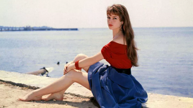 Czerwona koszulka z szerokim dekoltem, odkrytymi ramionami, długa, niebieska spódnica z falbankami i element, który uczyni z niej legendę mody: kultowe czerwone balerinki aktorki. Jeszcze w blasku słońca w Cannes, na marginesie Festiwalu, aktorka przeobraża się w symbol kobiecości przed obiektywami fotografów.