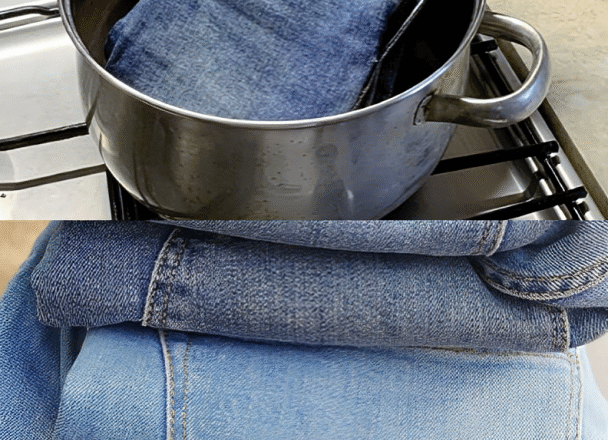 - Umieść dżinsy w naczyniu żaroodpornym , upewniając się, że są całkowicie zanurzone. Gotuj wodę na wolnym ogniu przez około 10 minut.