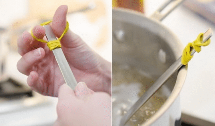 1. Aby łyżka nie stoczyła się z brzegu patelni, owiń jej koniec zwykłą gumką recepturką.