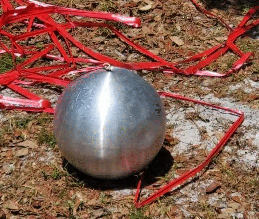 Czerwone wstążki na zdjęciu mają swoje zadanie. Stabilizują opadanie kuli , utrzymują ją w odpowiedniej pozycji i sprawiają, że jest widoczna dla ekip ratunkowych – lub ciekawskich właścicieli gruntów.