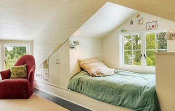Oryginalny pomysł na umieszczenie łóżka piętrowego pod dachem mansardowym.