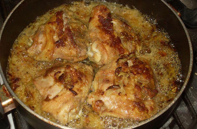 Pokrój cebulę w ćwiartki i smaż na patelni na oleju roślinnym do uzyskania złocistego koloru. Przesuń cebulę na brzegi patelni, a na środku ułóż kawałki kurczaka. Smaż je z obu stron przez 6-7 minut.