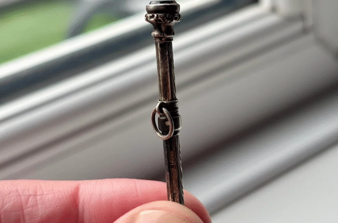 Niedawno w starym domu rodzinnym odkryto takie znalezisko – cienki kawałek metalu przypominający ołówek automatyczny Mordan, zwieńczony czerwonym klejnotem.