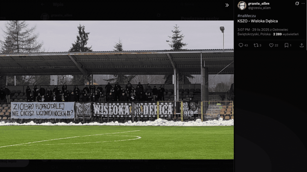 Na stadionie Wisłoki Dębica doszło do zdarzenia, które szybko wywołało ogólnopolską dyskusję. Podczas meczu z KSZO 1929 Ostrowiec Świętokrzyski na ogrodzeniu pojawił się transparent wymierzony w Zbigniewa Ziobrę. Treść baneru była mocna i nie pozostawiała miejsca na interpretacje: „Ziobro fujaro, dalej nie chcesz liczonych nocek w ZK?”.