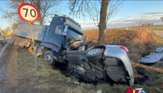 Tragedia w miejscowości Golany w powiecie przasnyskim. Samochód ciężarowy zderzył się z samochodem osobowym, kierowca mniejszego auta zginął na miejscu.