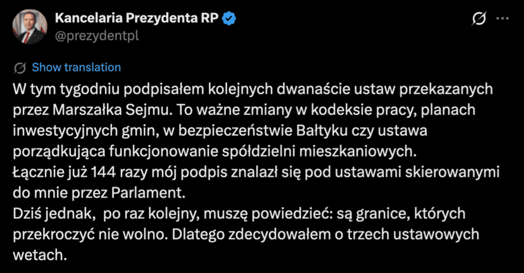 Karol Nawrocki poinformował w piątek, że zawetował trzy ustawy uchwalone przez parlament, jednocześnie podpisując dwanaście innych aktów prawnych. Informacja została przekazana w formie opublikowanego nagrania, w którym prezydent szeroko uzasadnił swoje stanowisko. Moment ogłoszenia decyzji nie był przypadkowy – nastąpił krótko przed jego spotkaniem z premierem Donaldem Tuskiem, co dodatkowo wzmocniło polityczny kontekst całej sprawy.