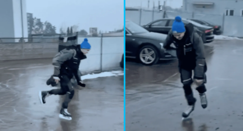Pracownik wjechał na parking firmowy na łyżwach – nagranie podbija sieć