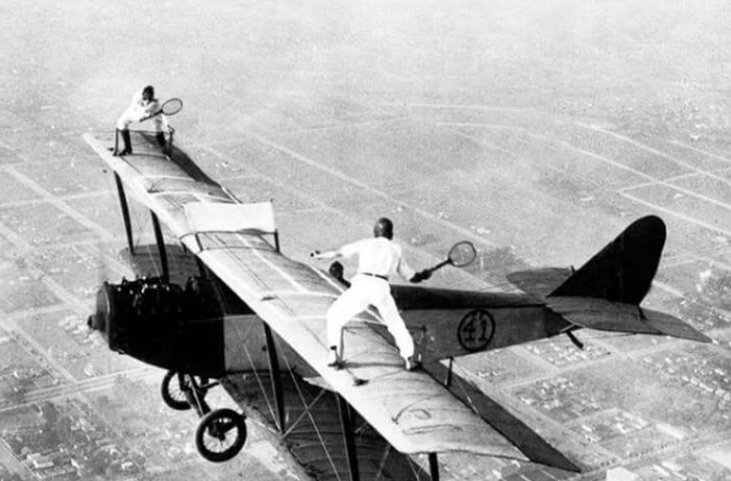 Kaskaderzy próbują grać w tenisa na skrzydłach samolotu, 1923 r.