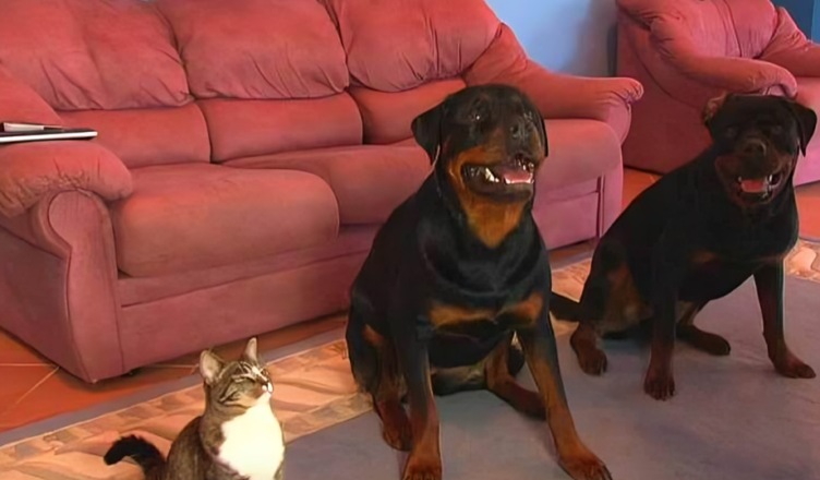 Obejrzyj ten niesamowity film przedstawiający kota siedzącego obok dwóch rottweilerów, które potrafią wykonywać te same sztuczki co psy!