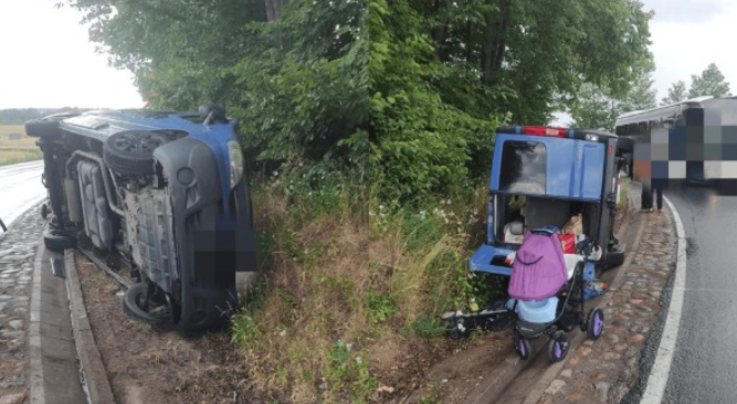 Bus wjechał do rowu i przewrócił się na bok. Pojazdem podróżowało dziewięć osób, w tym sześcioro dzieci. Na szczęście w zdarzeniu nikt nie poniósł obrażeń.