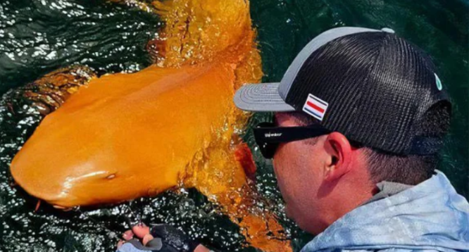 U wybrzeży Kostaryki, w pobliżu Parku Narodowego Tortuguero, rybacy złowili niezwykłego rekina pomarańczowego o całkowicie białych oczach.