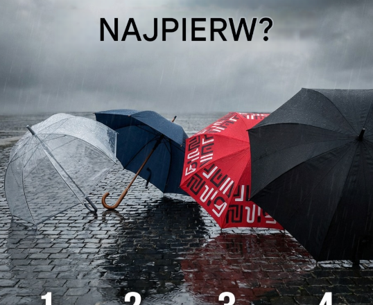 Przyjrzyj się uważnie temu zdjęciu. Cztery parasole czekają na swojego właściciela, zapraszając Cię do dokonania wyboru. Pierwszy jest lekki, przezroczysty, niemal nieważki, odsłaniając świat wokół Ciebie, pozwalając Ci zobaczyć niebo nawet wtedy, gdy płacze. Drugi to klasyczny ciemnoniebieski, z solidnym, zakrzywionym uchwytem i dyskretnym designem, który zawsze wydaje się symbolem spokoju i pewności siebie. Trzeci to jasny, wyrazisty czerwony parasol z abstrakcyjnym, geometrycznym wzorem, który z pewnością wyróżni Cię w szarym tłumie. I wreszcie czwarty to solidna, czarna czasza, ucieleśnienie surowości, minimalizmu i ochrony przed każdą pogodą. Każdy z nich zdaje się prosić o wzięcie go do ręki, tworząc niepowtarzalny klimat w tym deszczowym krajobrazie.
