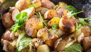Dla dużych rodzin szukających przytulnego posiłku, ta patelnia ziemniaczana z karmelizowaną cebulą i jajkami to doskonały wybór. Jej zaskakująco proste przygotowanie oferuje autentyczne