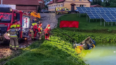 Tragedia w miejscowości Paluzy w woj. warmińsko-mazurskim. Młody mężczyzna zginął, po tym jak ładowarka teleskopowa, którą kierował, wpadła do stawu. Maszyna przewróciła się