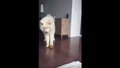 Spacerując po mieszkaniu, samojed przypadkowo nadepnął na piszczącą zabawkę, którą dziecko ciągle gdzieś upuszcza. Rozrzucone zabawki to połowa problemu, ale te piszczące i